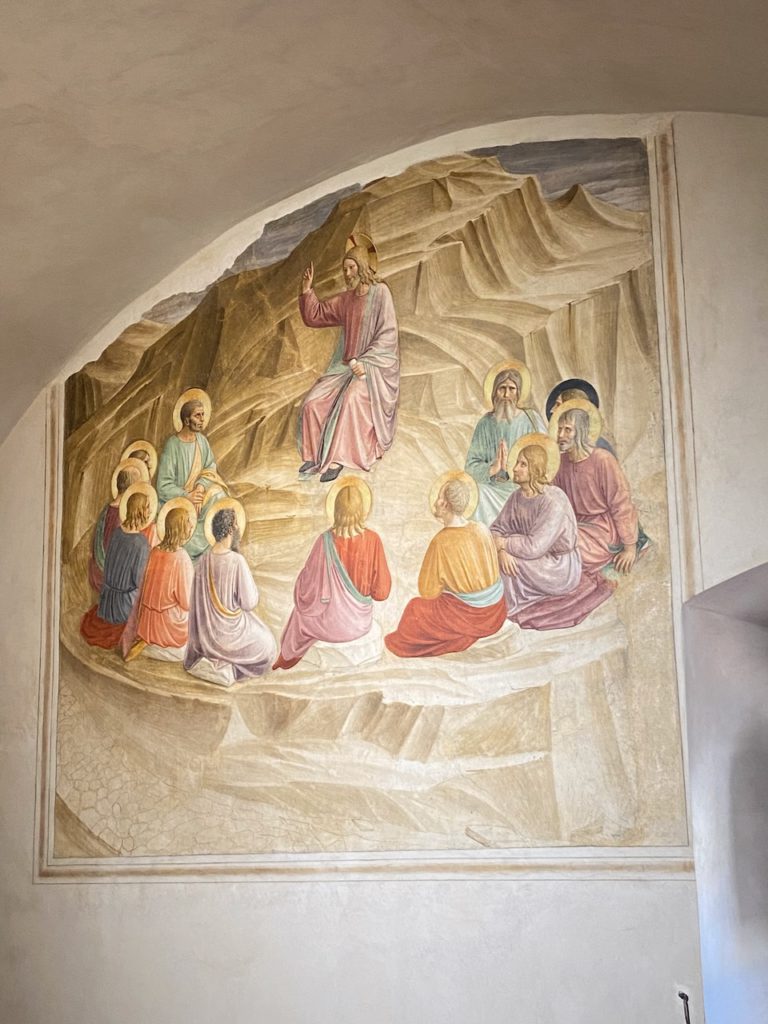 Nicht über die ganz Ausstellung, die noch bis zum 26. Jänner 2026 an zwei Florentiner Standorten, dem Palazzo Strozzi und dem Museo Nazionale di San Marco, zu sehen ist, aber von den Fresken im ehemaligen Dominikanerkloster San Marco, in dem Fra Angelico nach 1436 längere Zeit lebte. Dort malte er das Konvent im Auftrag von Cosimo de’ Medici zur Andacht und inneren Einkehr der Mönche aus.